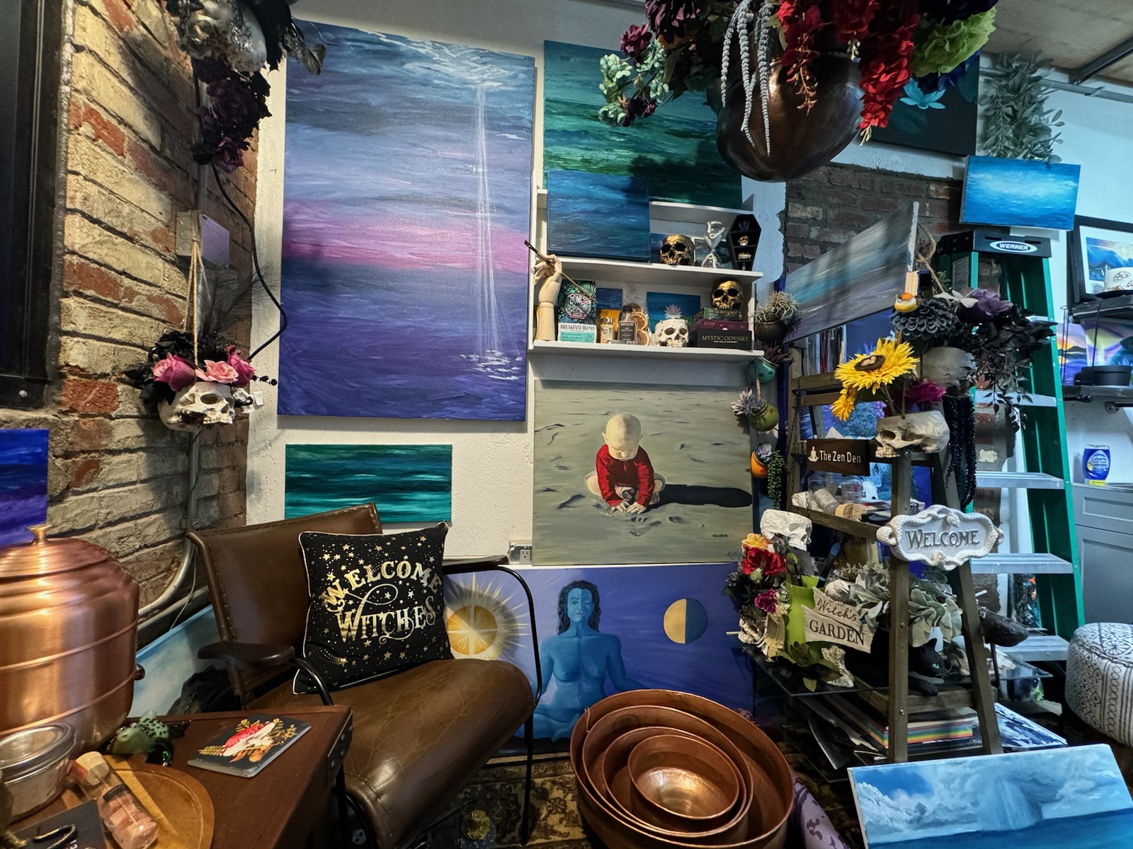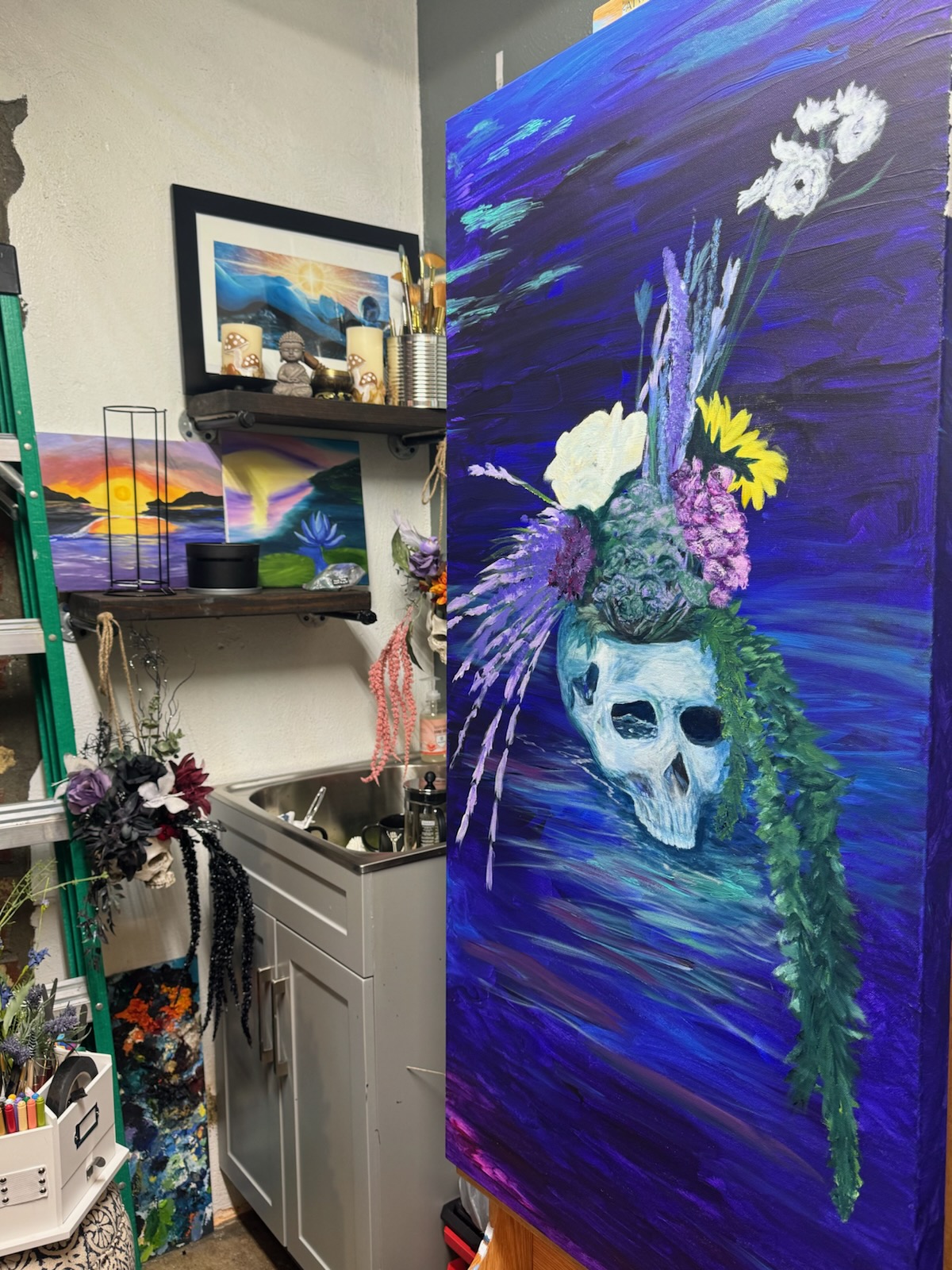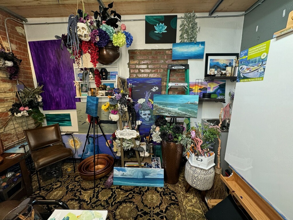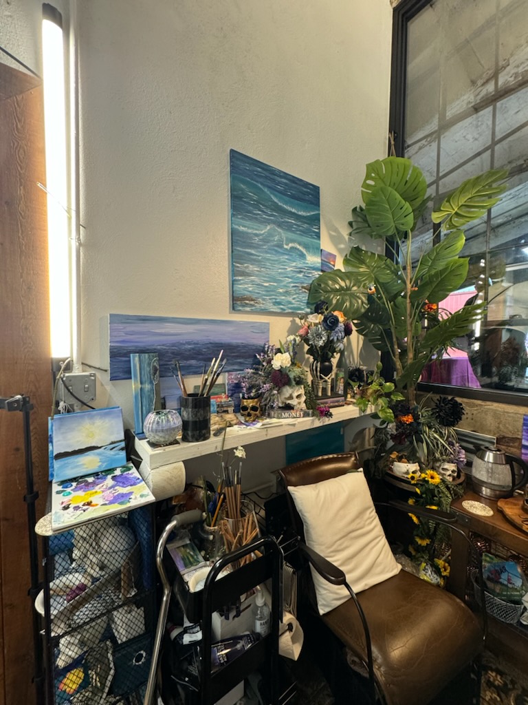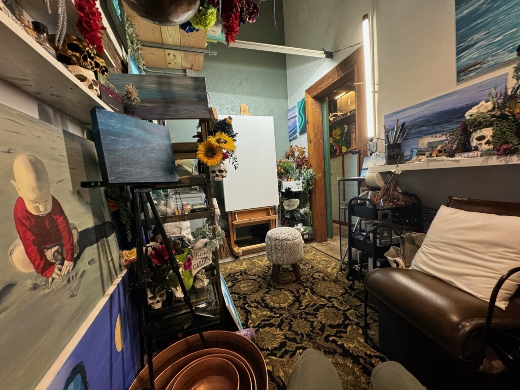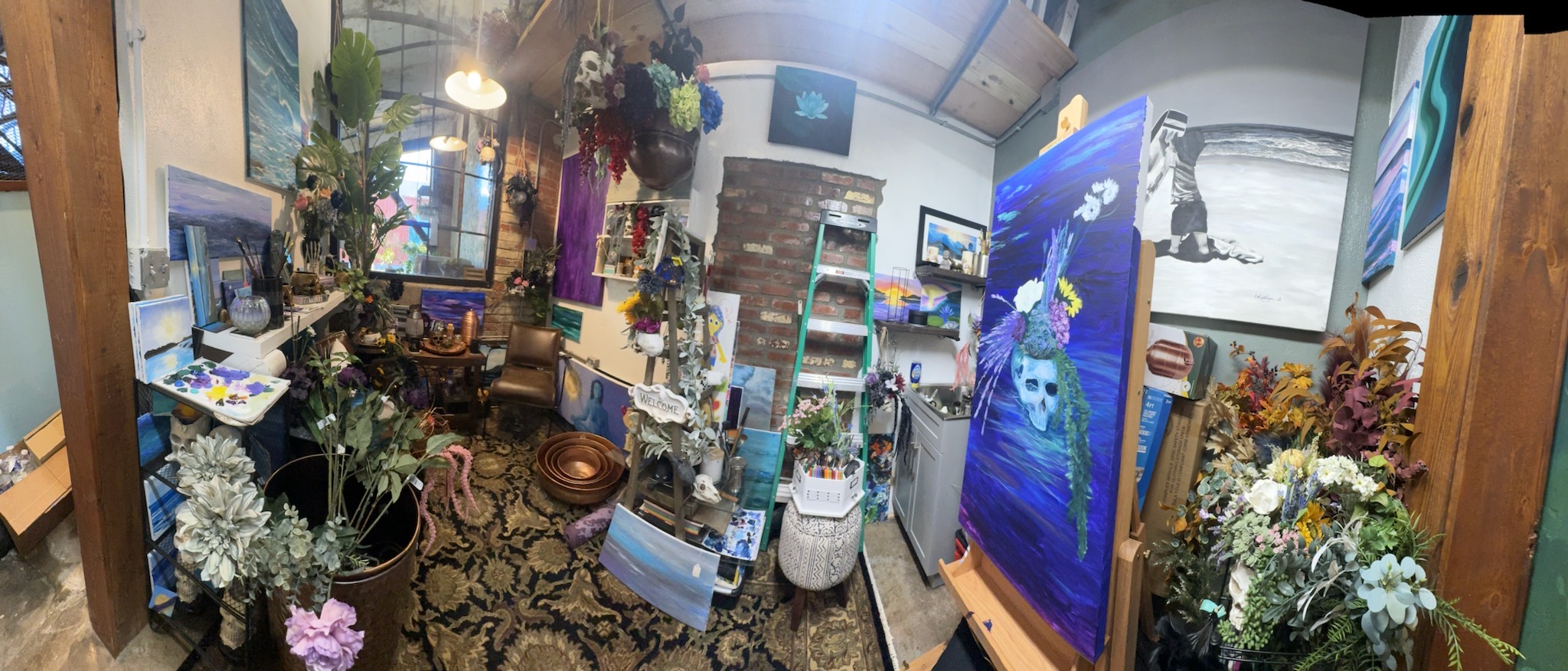Within this intimate space, you’ll discover art and a few curiosities. Kathryn’s paintings transport you to tranquil ocean beaches, capture the beauty of the human form, and a couple heartfelt stories through scenes of children playing on the beach. Her hauntingly beautiful skull paintings, adorned with vibrant flower arrangements, are inspired by her own handmade skull planters, which are also available for purchase in the studio.