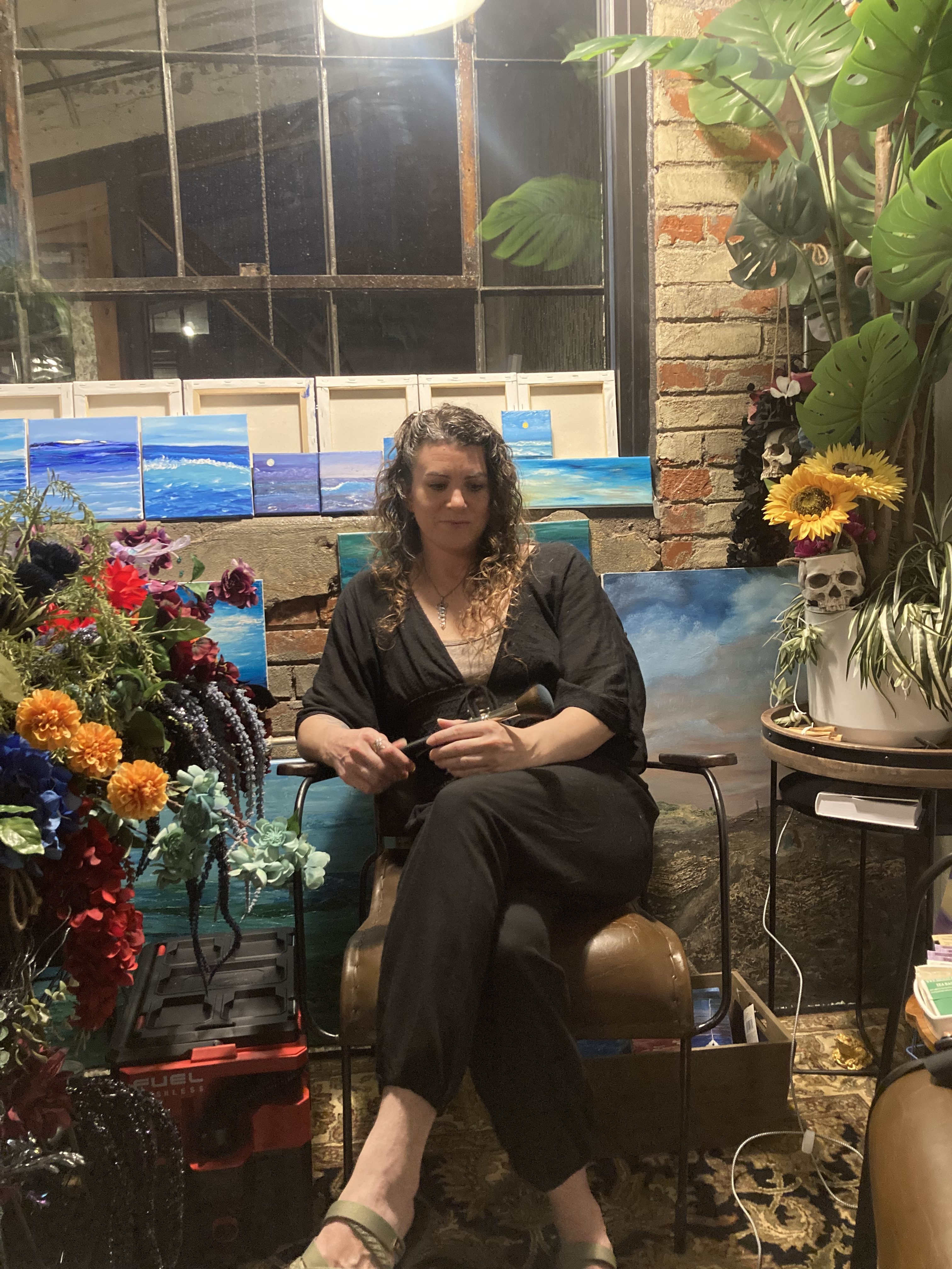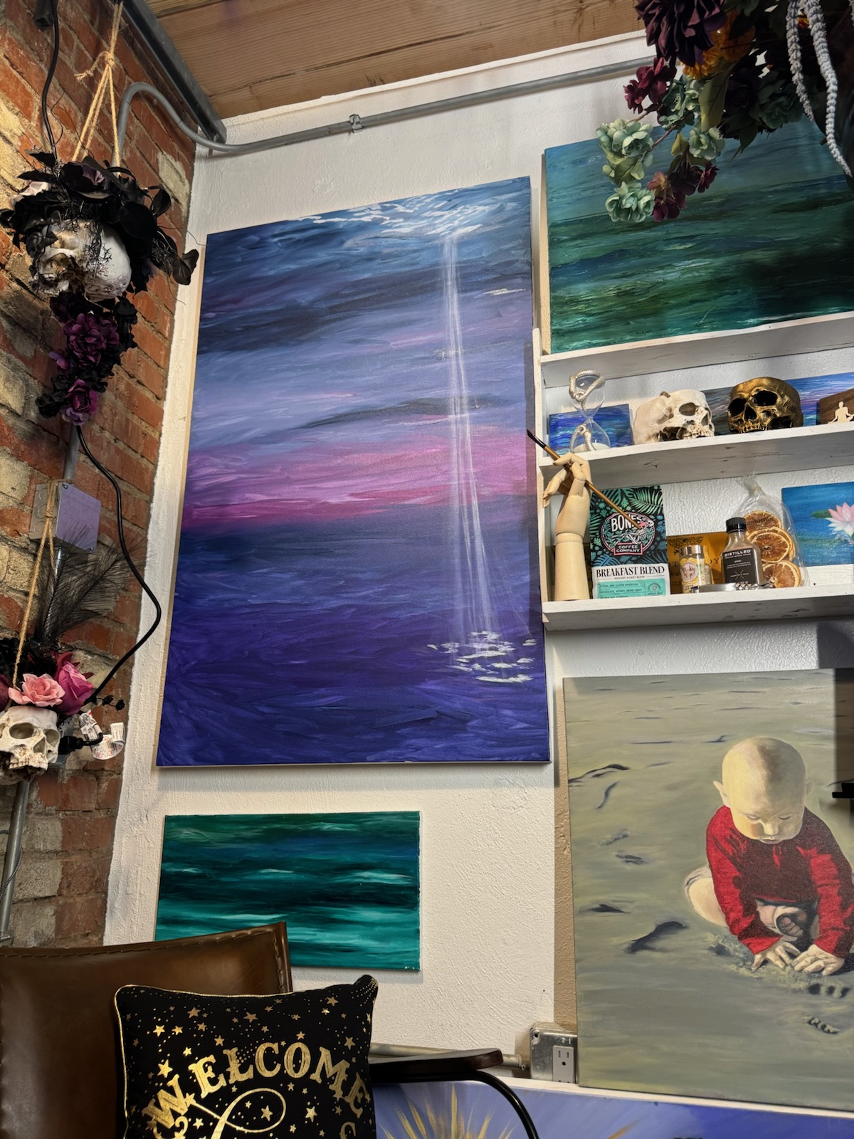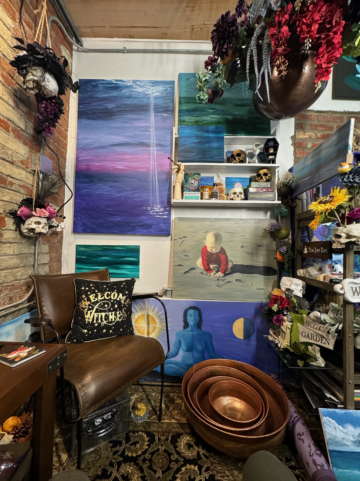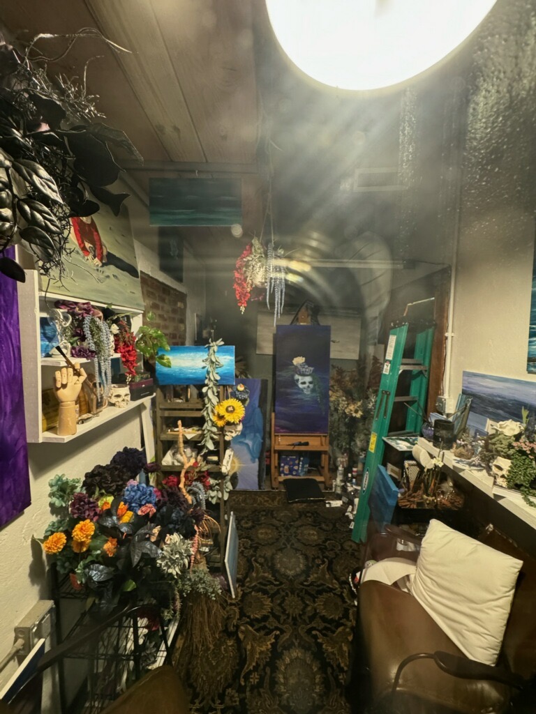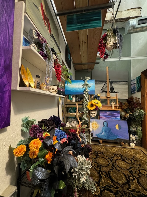 Within this intimate space, you’ll discover art and a few curiosities. Kathryn’s paintings transport you to tranquil ocean beaches, capture the beauty of the human form, and a couple heartfelt stories through scenes of children playing on the beach. Her hauntingly beautiful skull paintings, adorned with vibrant flower arrangements, are inspired by her own handmade skull planters, which are also available for purchase in the studio.