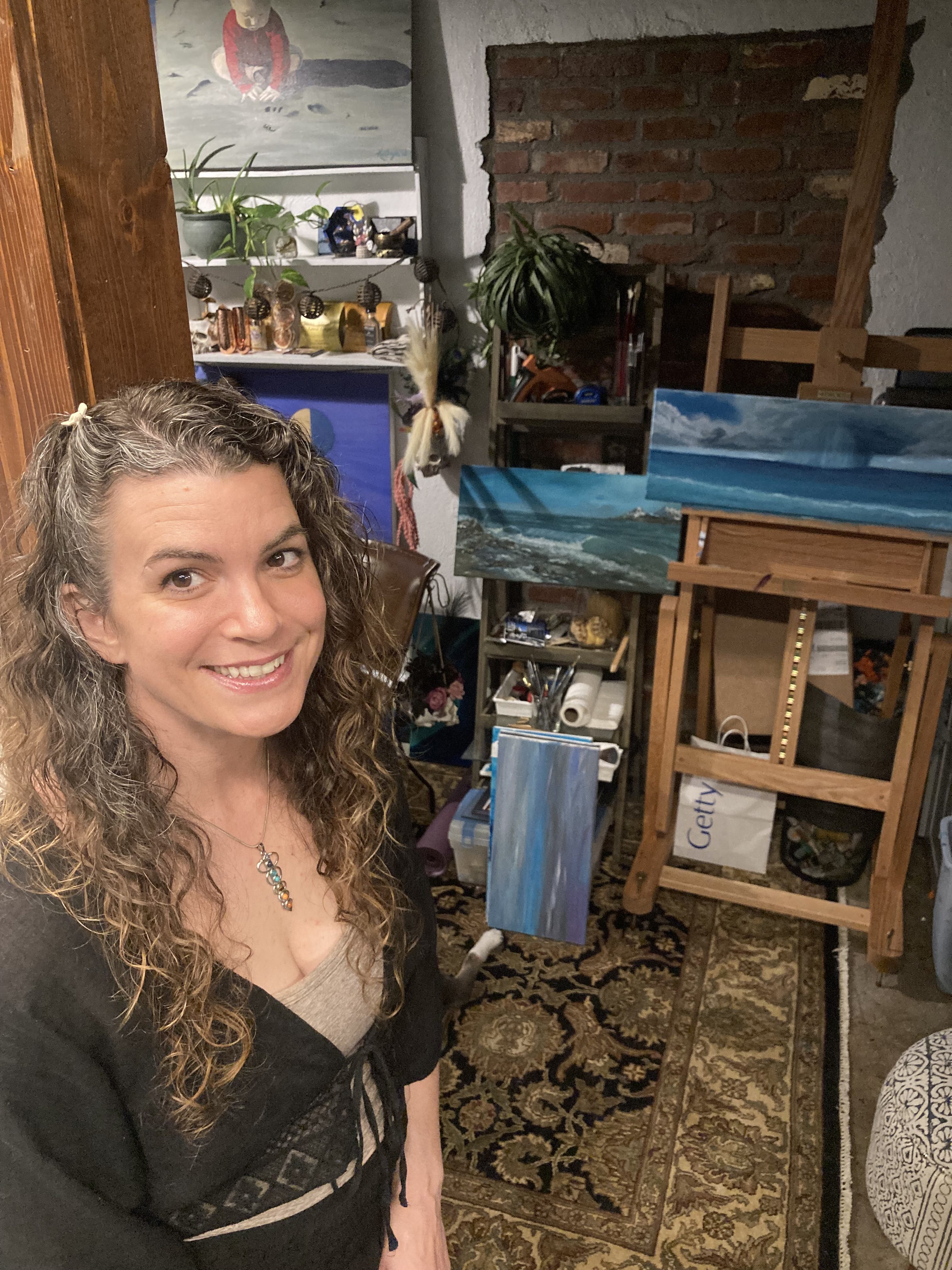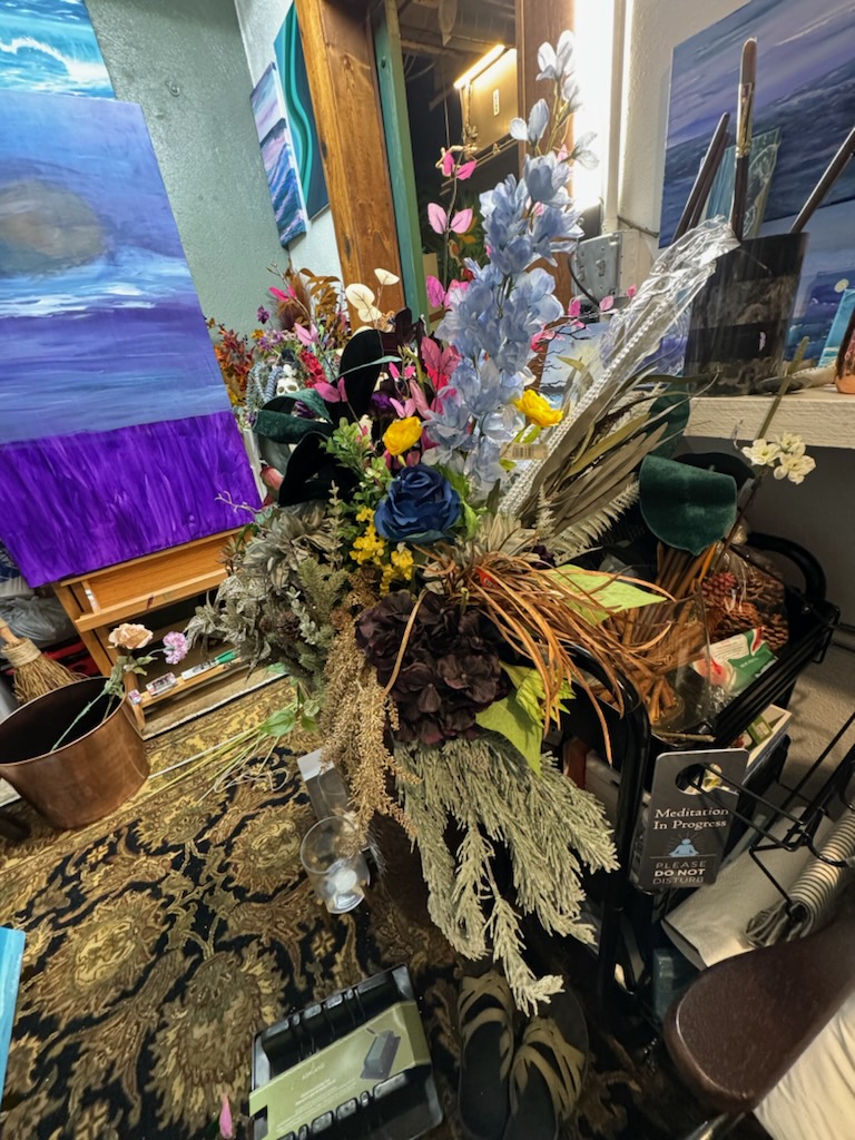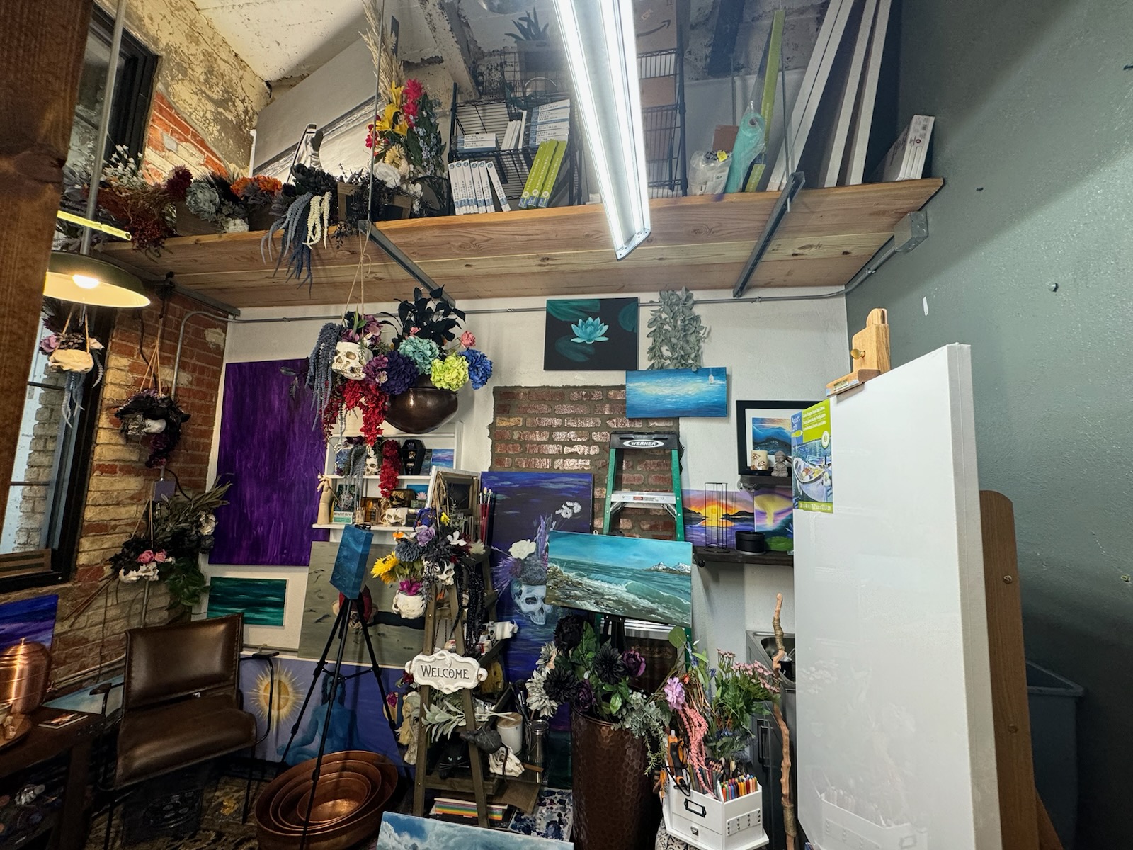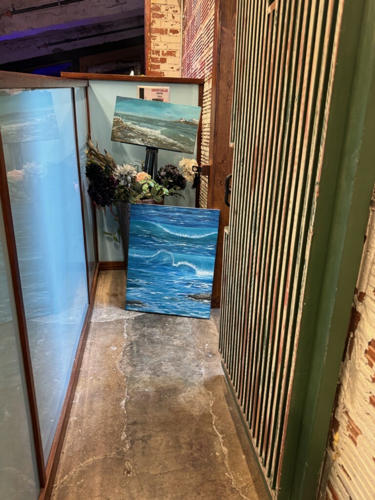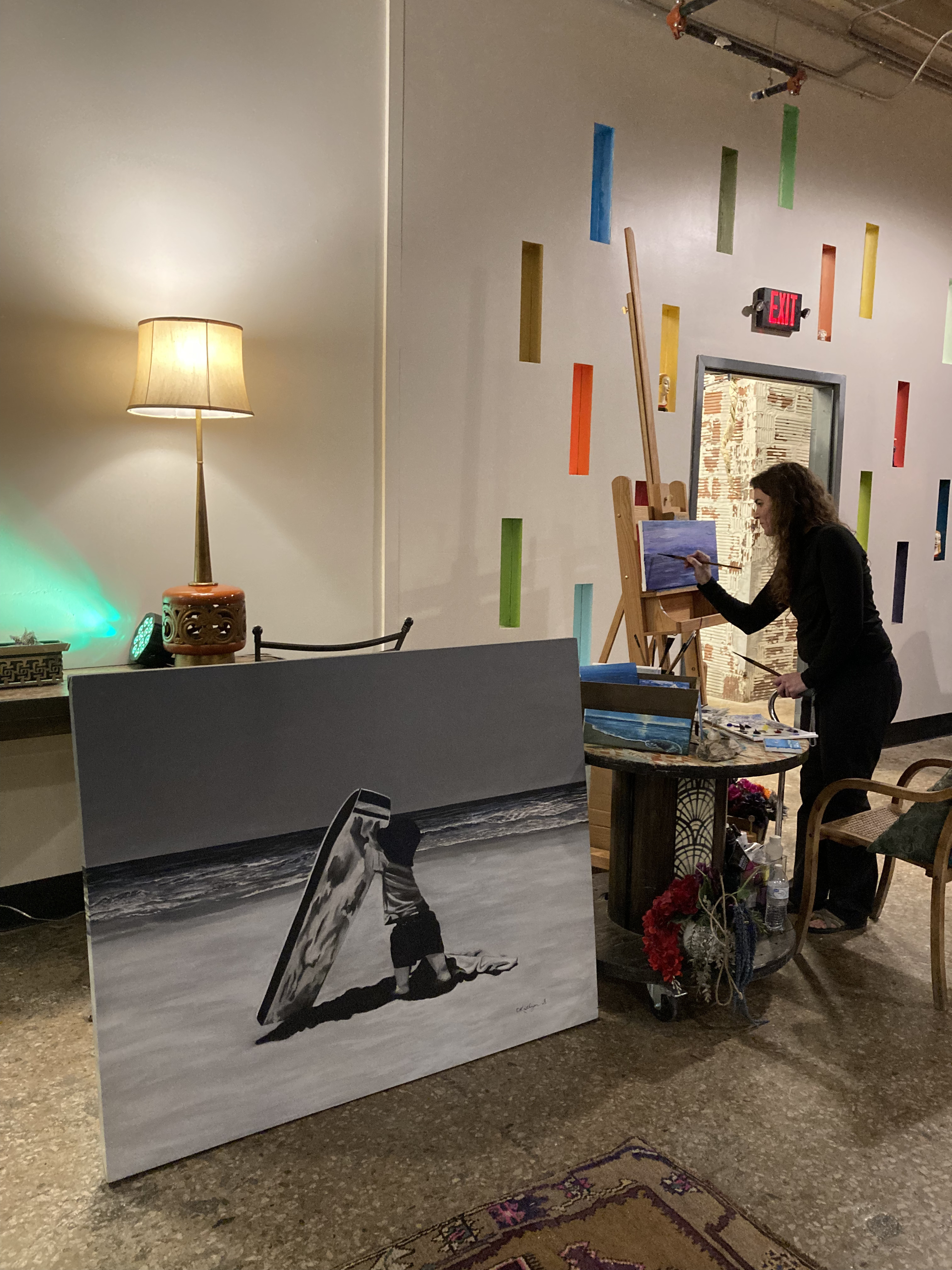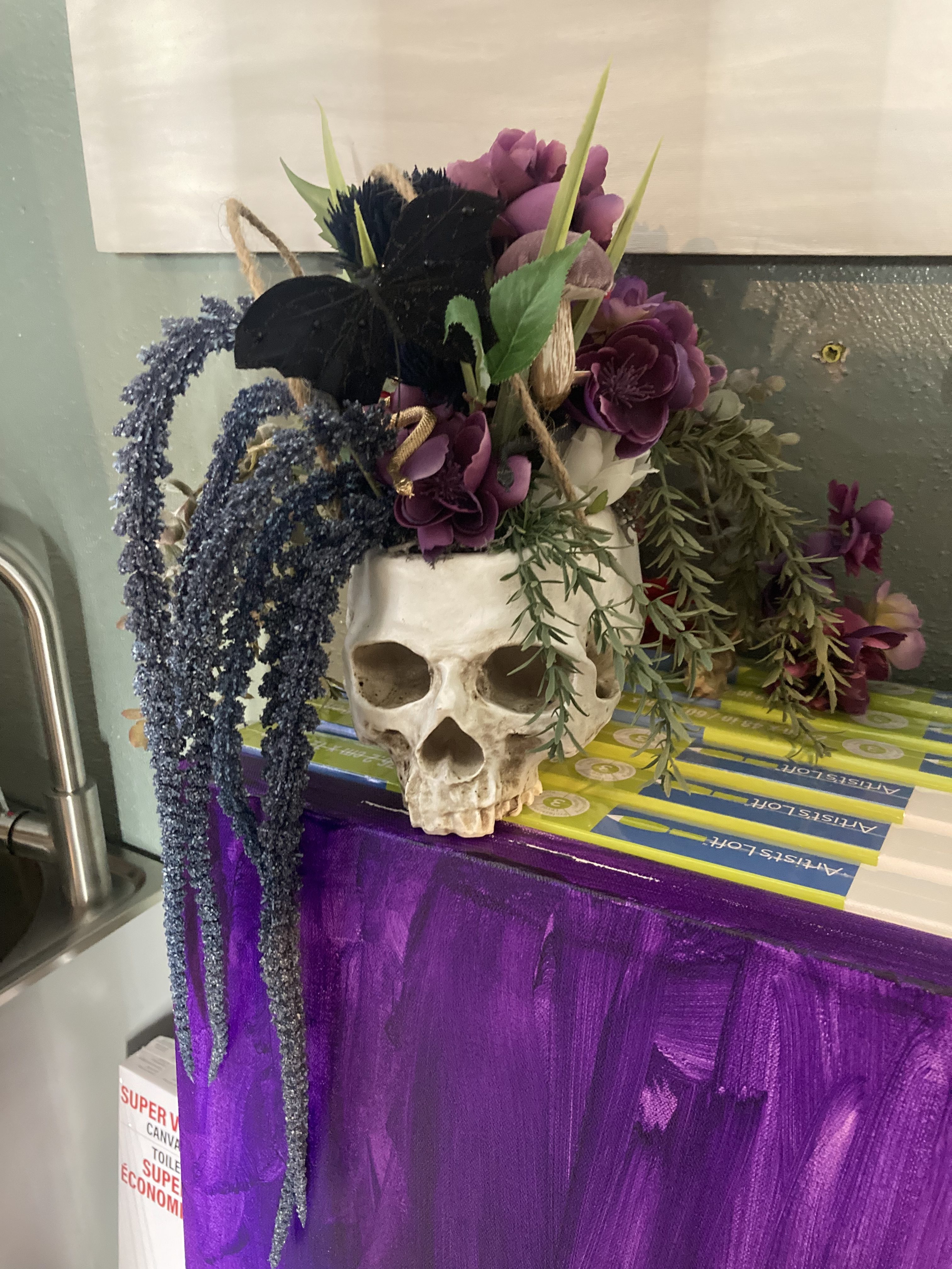 Within this intimate space, you’ll discover art and a few curiosities. Kathryn’s paintings transport you to tranquil ocean beaches, capture the beauty of the human form, and a couple heartfelt stories through scenes of children playing on the beach. Her hauntingly beautiful skull paintings, adorned with vibrant flower arrangements, are inspired by her own handmade skull planters, which are also available for purchase in the studio.