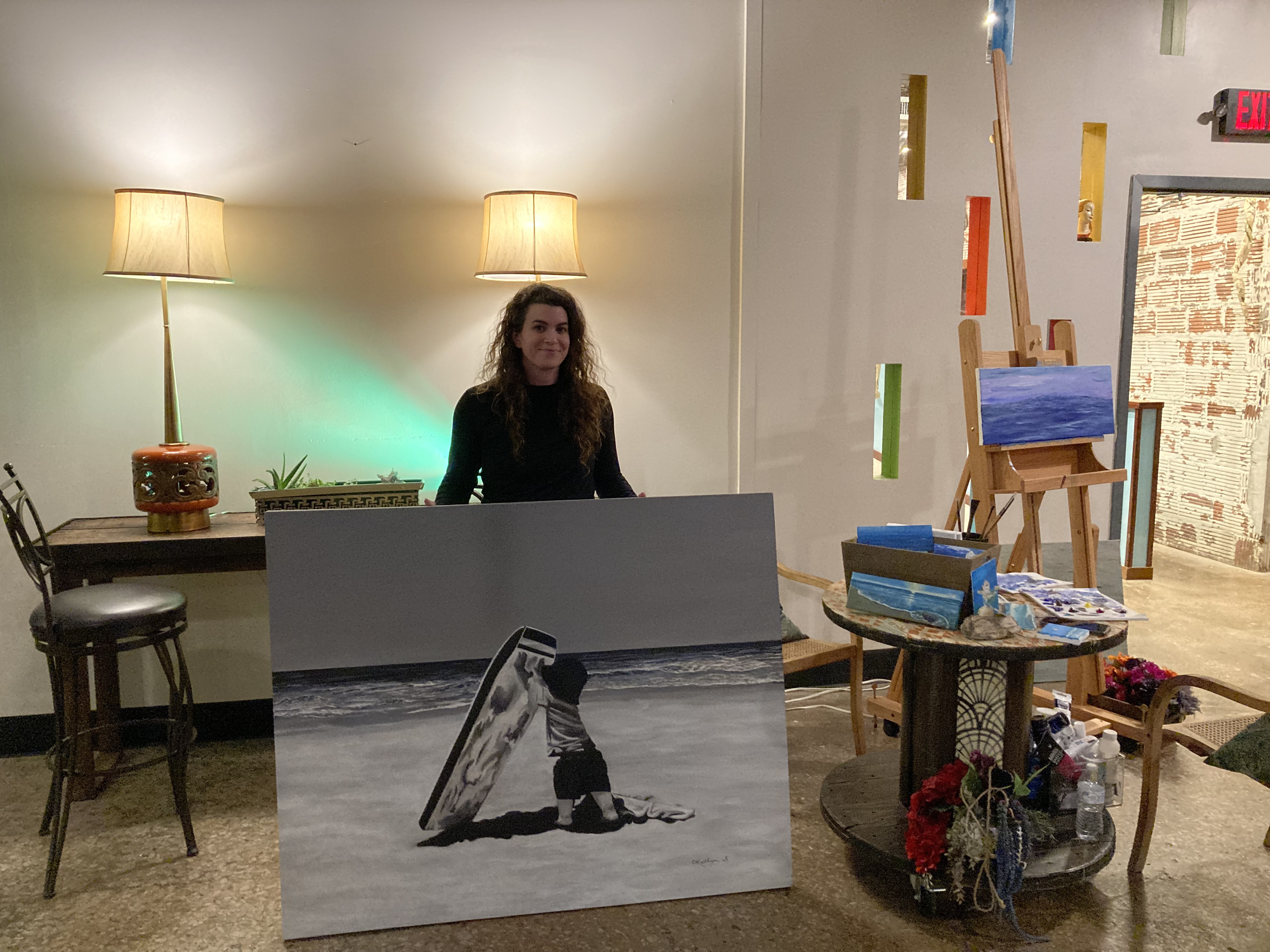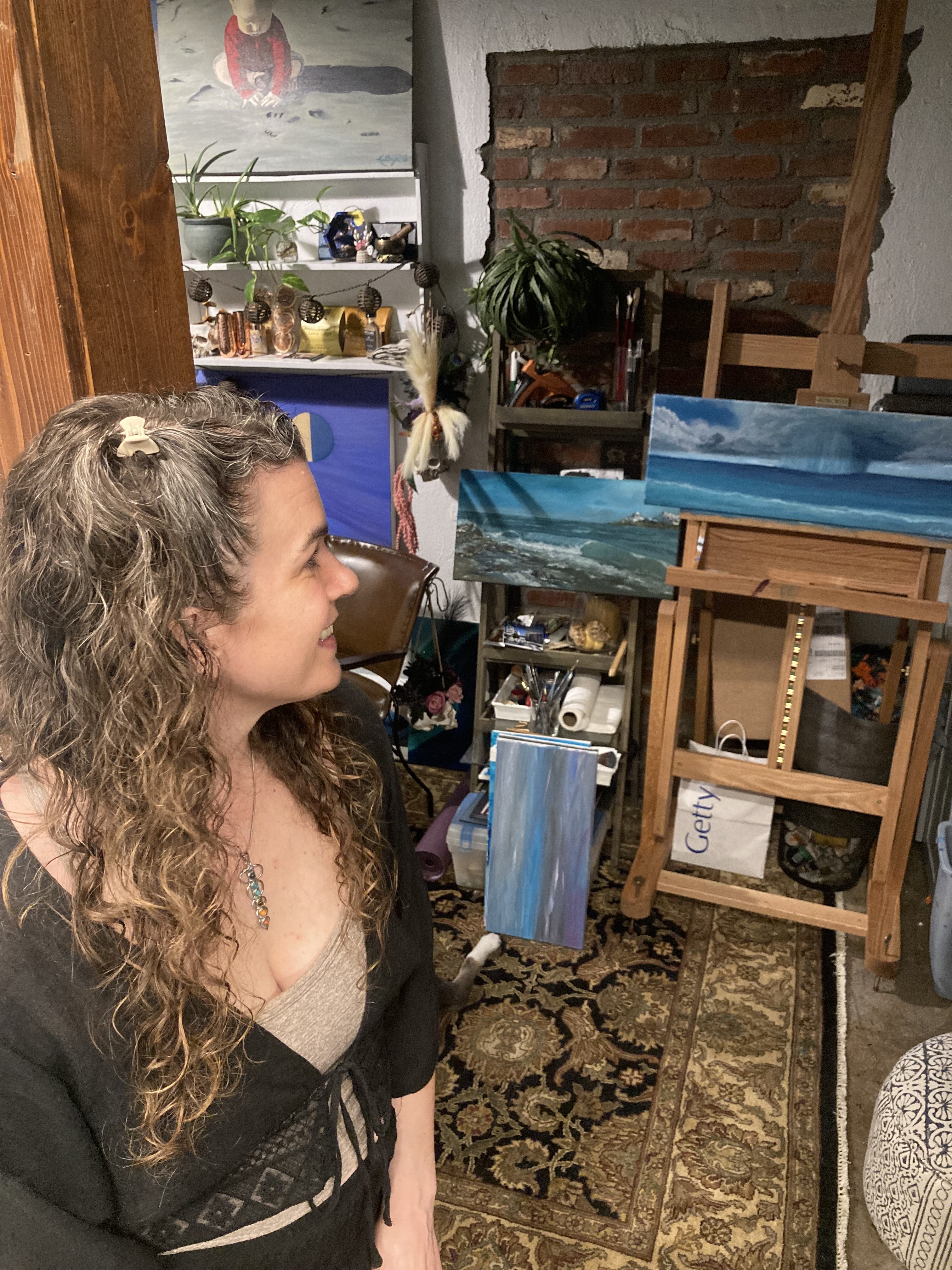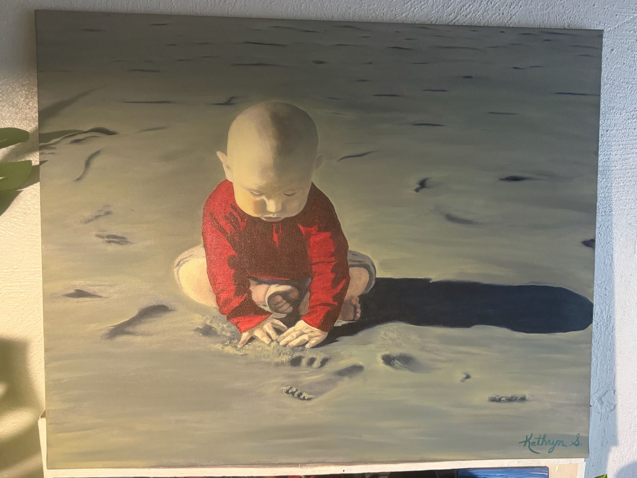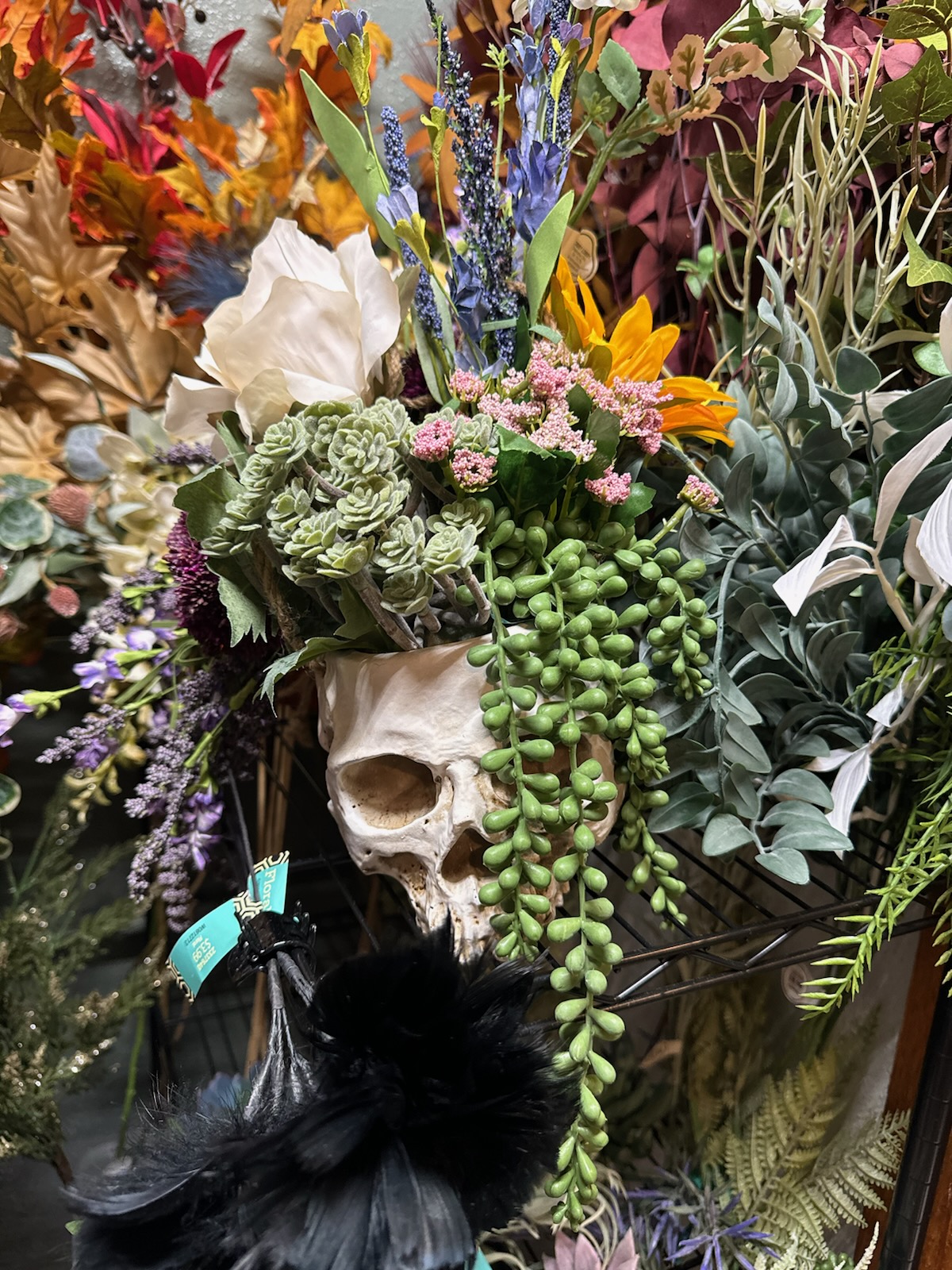 Within this intimate space, you’ll discover art and a few curiosities. Kathryn’s paintings transport you to tranquil ocean beaches, capture the beauty of the human form, and a couple heartfelt stories through scenes of children playing on the beach. Her hauntingly beautiful skull paintings, adorned with vibrant flower arrangements, are inspired by her own handmade skull planters, which are also available for purchase in the studio.