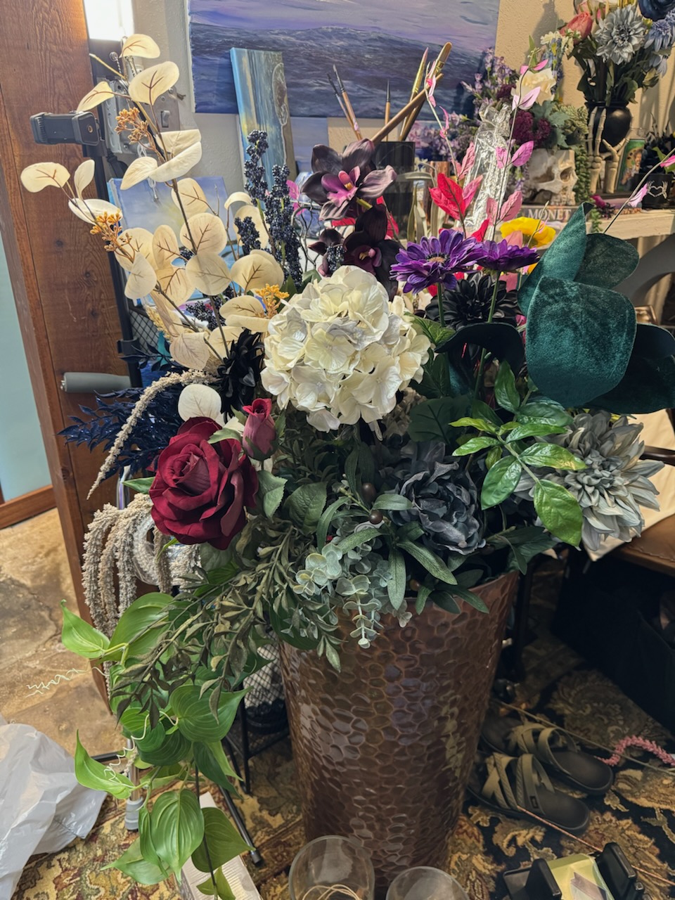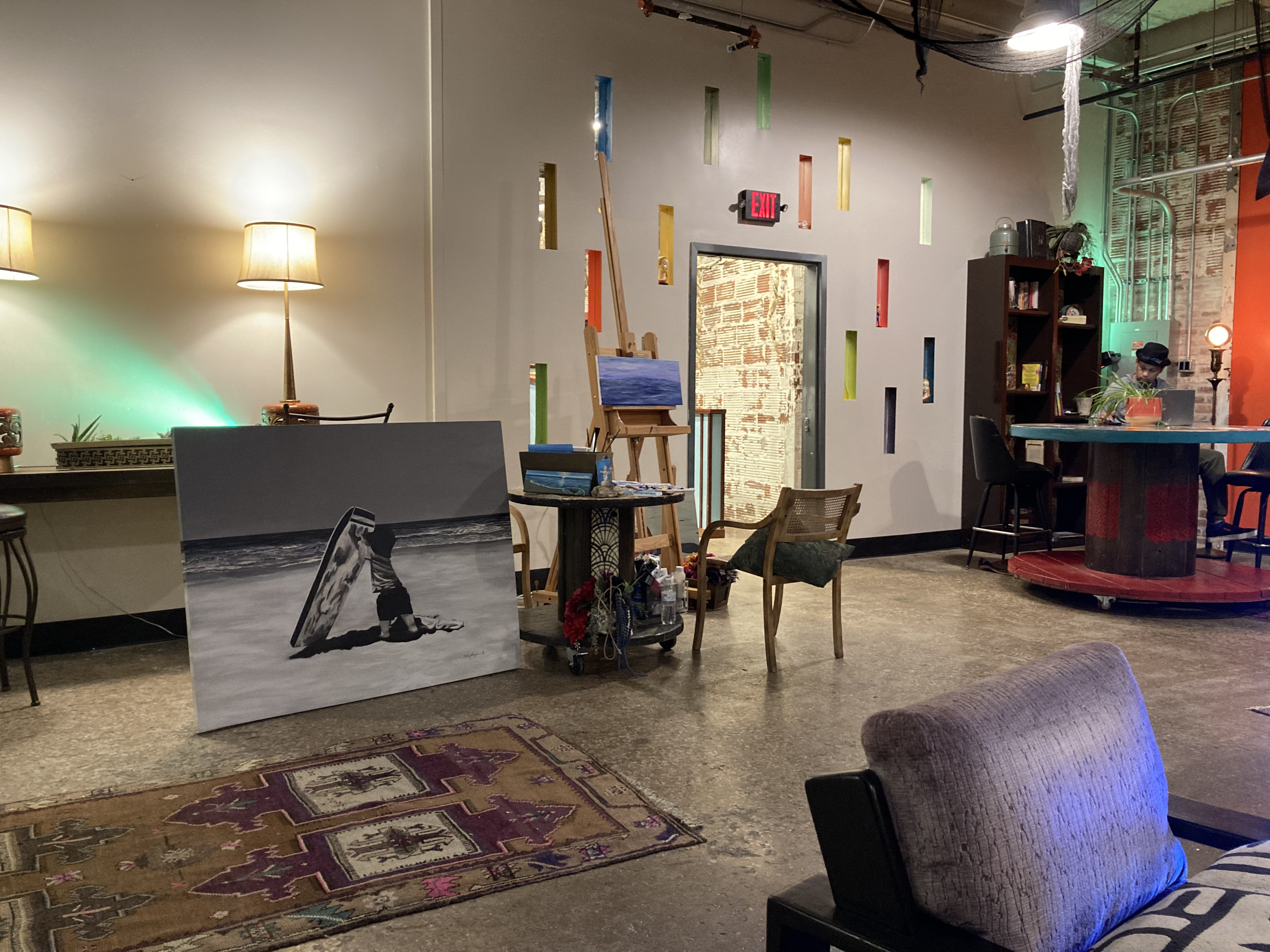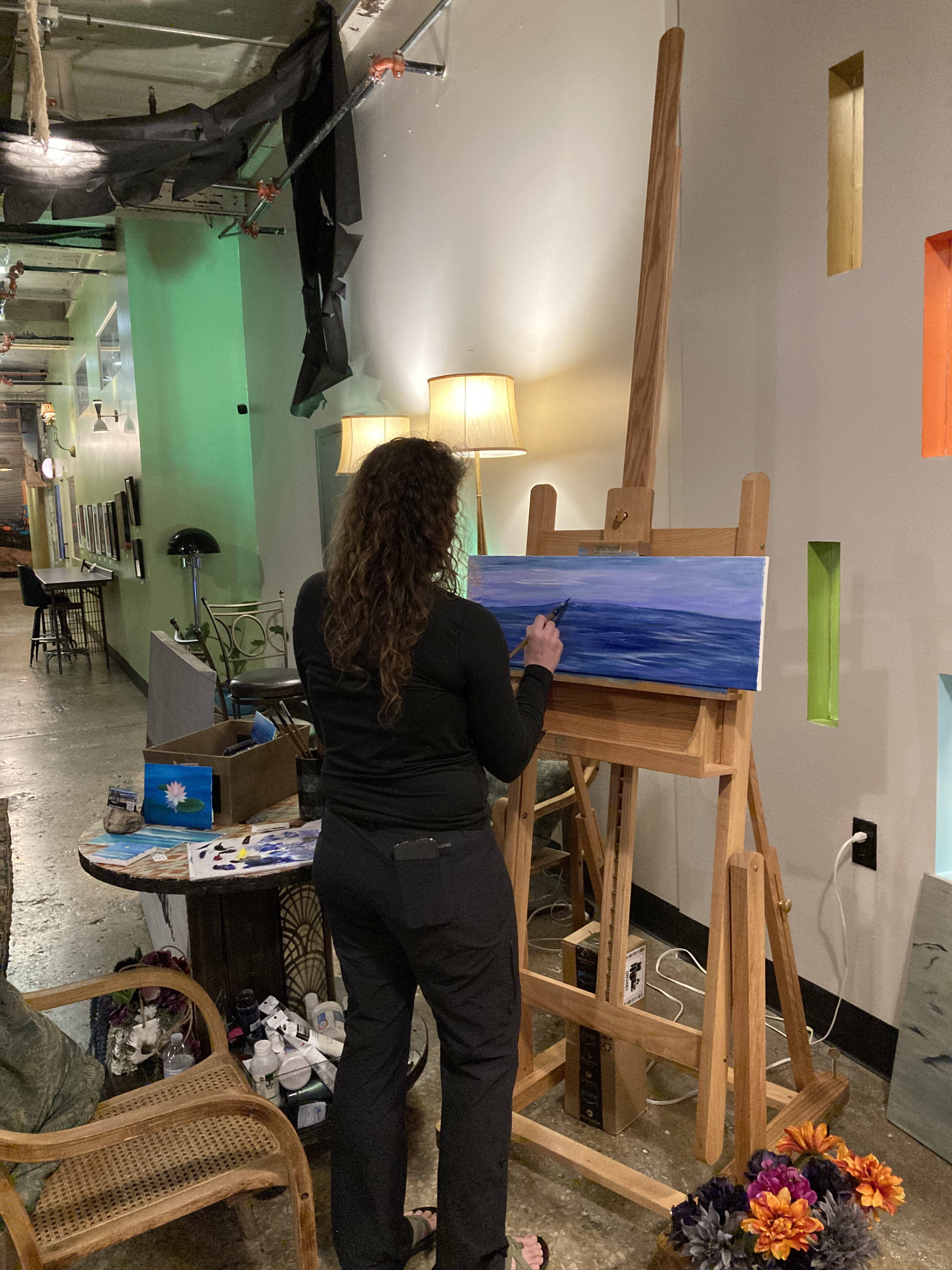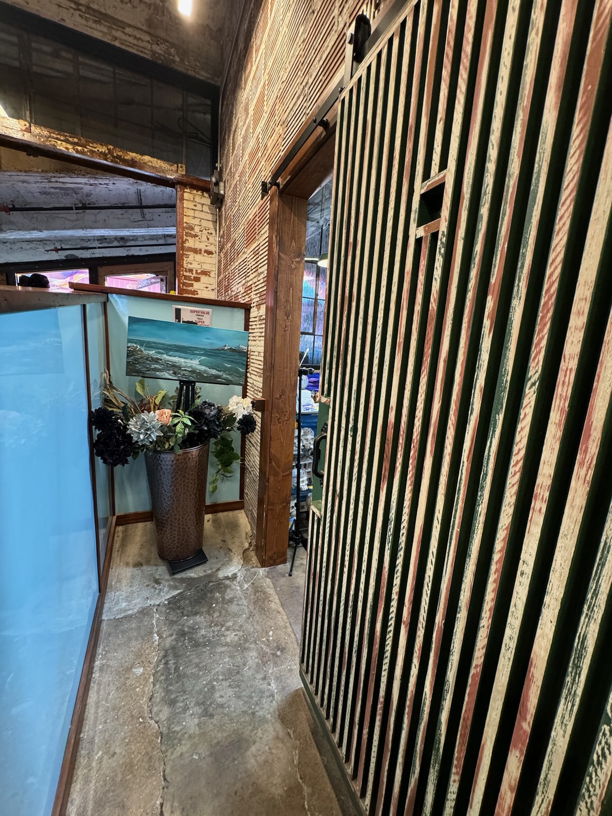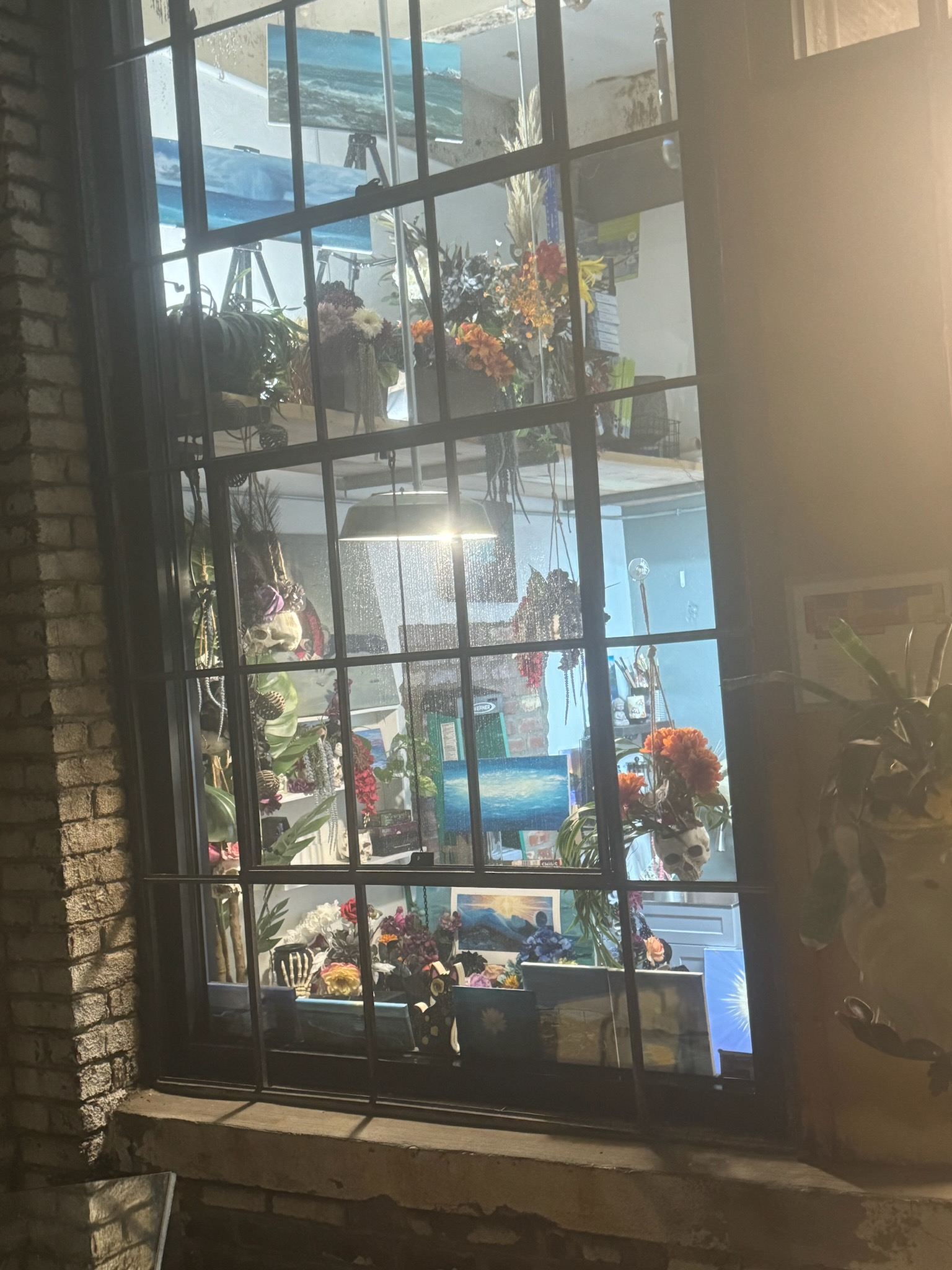 Within this intimate space, you’ll discover art and a few curiosities. Kathryn’s paintings transport you to tranquil ocean beaches, capture the beauty of the human form, and a couple heartfelt stories through scenes of children playing on the beach. Her hauntingly beautiful skull paintings, adorned with vibrant flower arrangements, are inspired by her own handmade skull planters, which are also available for purchase in the studio.